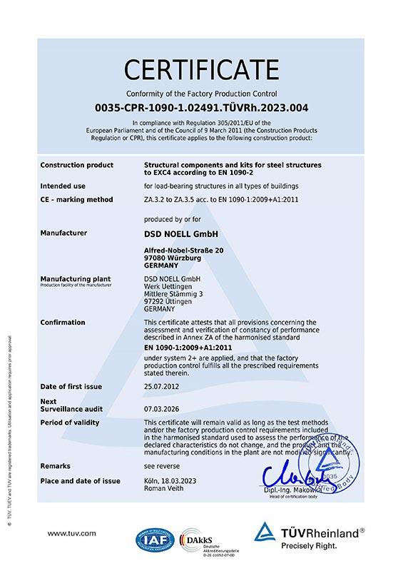 EC Certificate of Factory Production Control for structural components of steel up to EXC 4 acc. to EN 1090-2