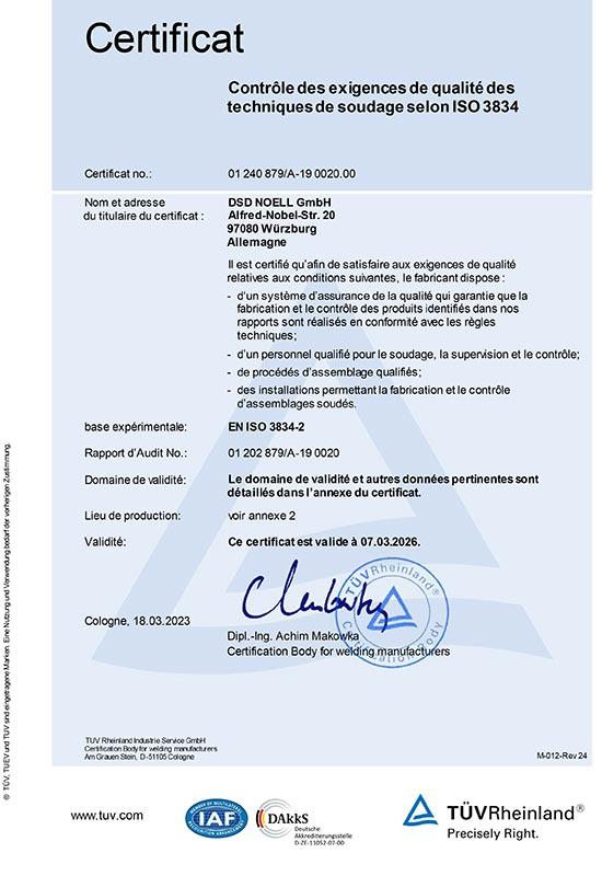 CertificatsISO 9001:2008DIN EN ISO 14001:2009Certificat CE - EN1090-2Eléments structuraux et kits de construction pour structures en acier EXC4 selon la norme EN 1090-2 ISO 45001:2018EN ISO 3834-2EN 1090-2:2018conforme à la norme EN 1090-1, tableau B.1 pour le soudage de structures en acier selon la norme EN 1090-2 |